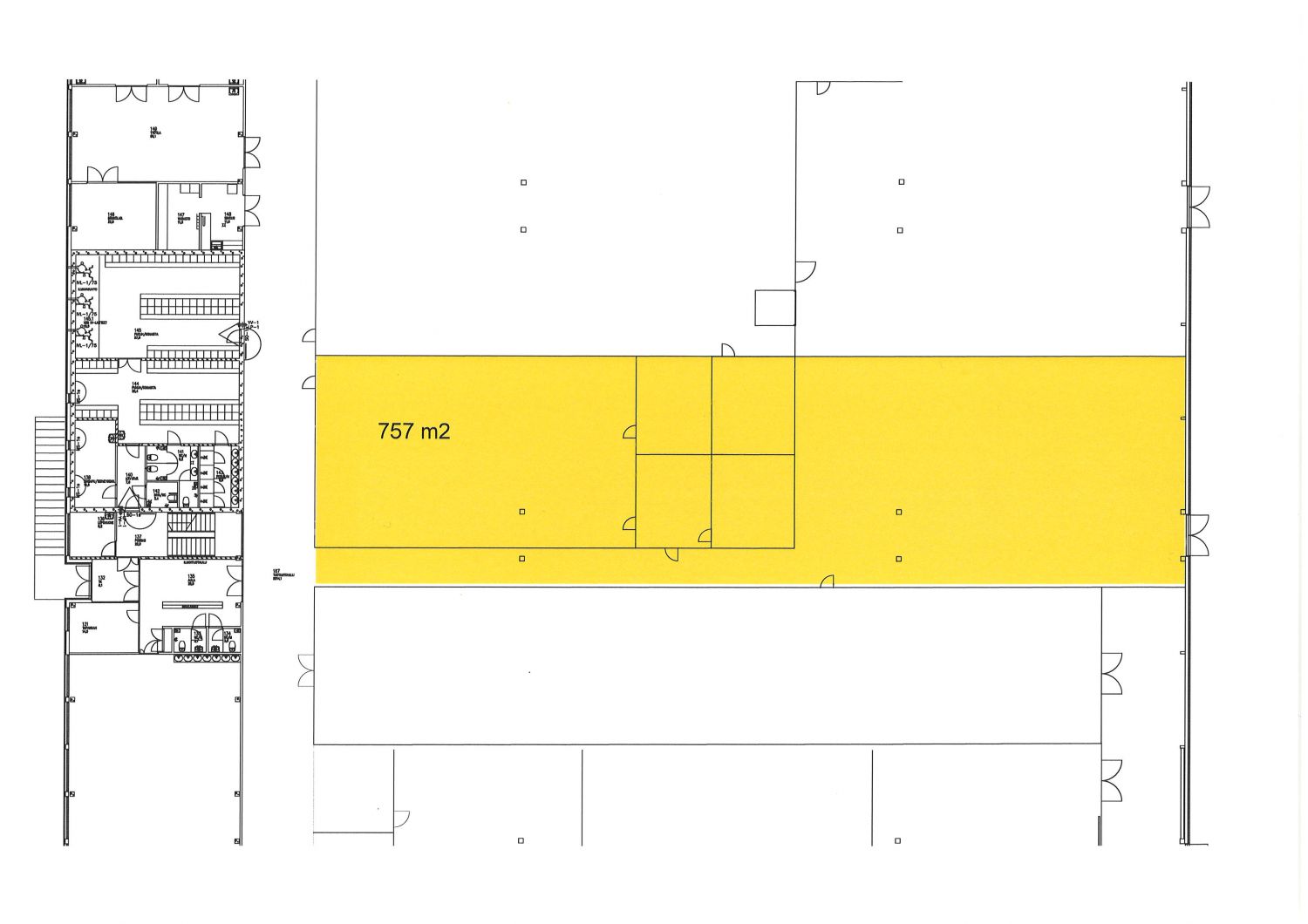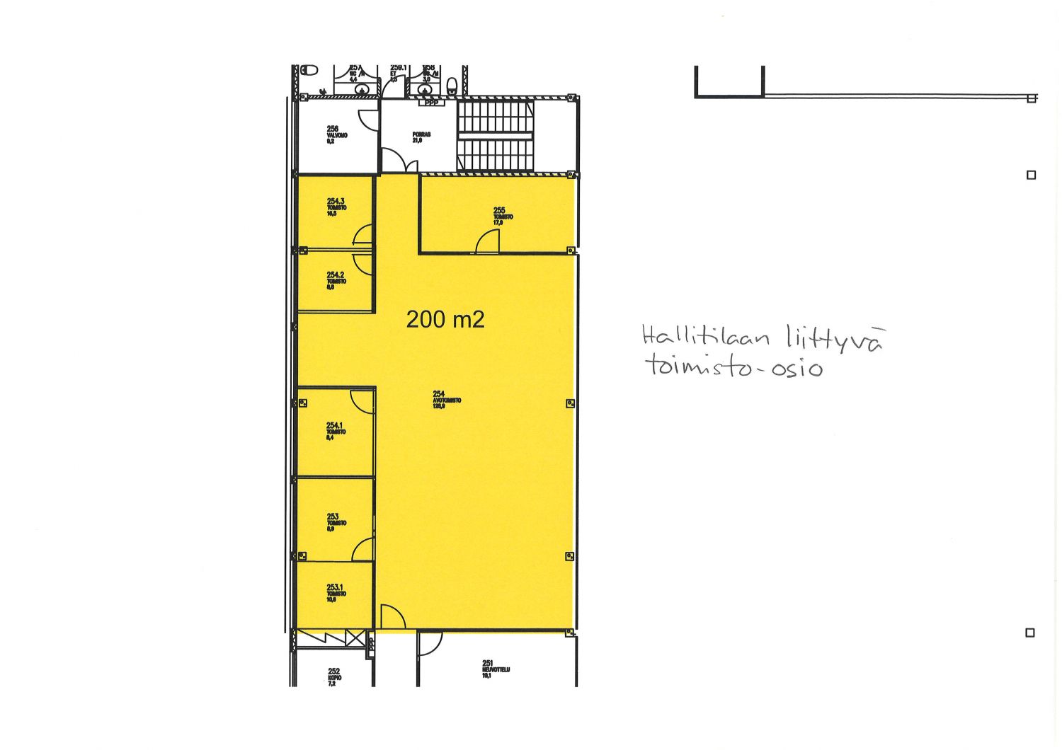 Hallirakennuksessa 2.kerroksen toimisto-osio 200m².