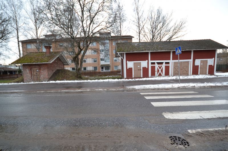 Erillinen tiilirakennus punaisen puurakennuksen vieressä.