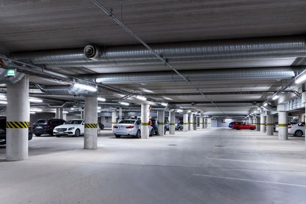 Parkkihalli, ja vieraspysäköinti talon edessä