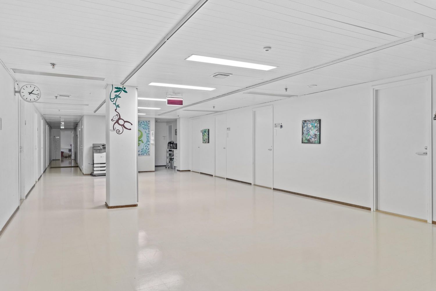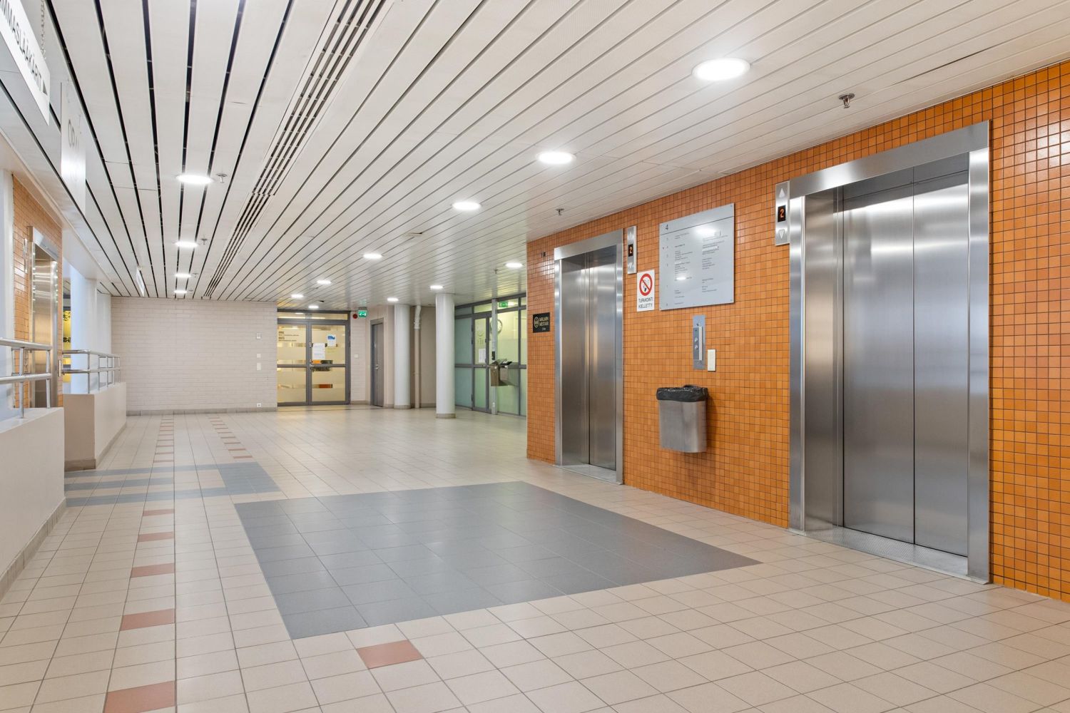 Toimistotilat yhdessä kerroksessa, keittiö x 2, useita wc:tä, siivouskomero, varastointitilaa, tavarahissi, josta käynti