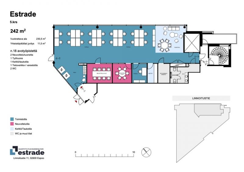 Tämä tila on kooltaan 230m2 ja se sijaitsee kiinteistön 5. kerroksessa. Toimiston pinta-alaan lisätään vielä 11,5m2 jyvitykset, eli osuus yhteiskäyttöalueista.