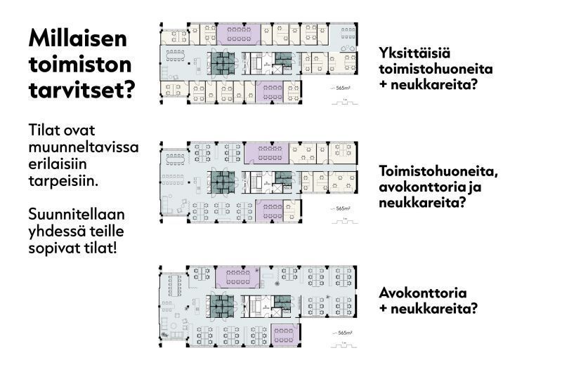 Me järjestämme! Tilamme ovat muunneltavissa useisiin eri tarpeisiin. Autamme sinua sopivien tilojen suunnittelussa ja toteutamme teille muuttovalmiit tilat helposti.