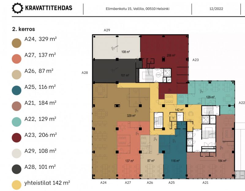Vuokrataan toisen kerroksen 137m2 toimistotila, joka on muokattavissa juuri sellaiseksi että se palvelee yrityksen tarpeita optimaalisesti. Modernit puitteet klassikkotalossa ovat inspiroiva työympäristö, niin työntekijöille kuin asiakkaillekin. Kiinteistössä on Fazerin lounasravintola- ja kahvilakonsepti Ravintola Kravattitehdas. Talossa on eri kokoisia kokoustiloja ja auditorio (60-70 hlö) uudistettu 2018. Kiinteistössä myös sähköauton latauspiste. Tulossa lainapolkupyöriä. Autopaikkoja on yhteensä 176. Naapuritontilla on Q-Park Vallila, jossa on 700 pysäköintipaikkaa Julkisen liikenteen osalta raitiovaunu- ja bussipysäkkejä löytyy muutaman sadan metrin päästä, lähimmät raideliikenteen asemat puolestaan Pasilasta (juna) ja Sörnäisistä (metro).