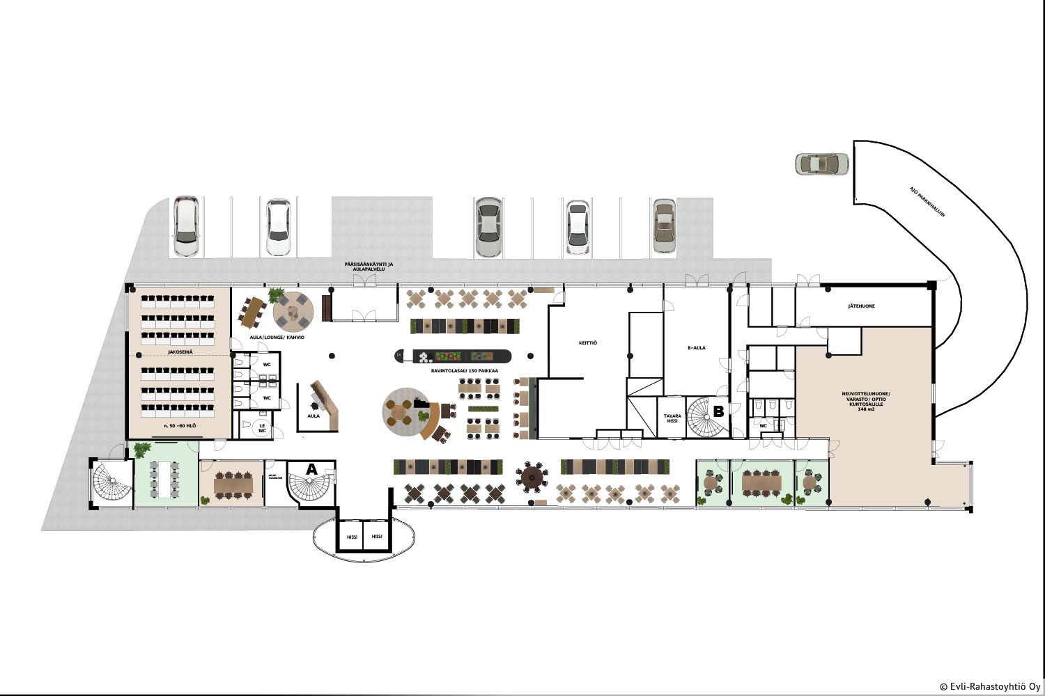 Auditorio, henkilöstöravintola, catering, vuokrattavia neuvottelutiloja, aulapalvelu