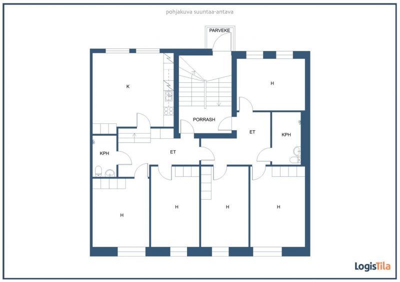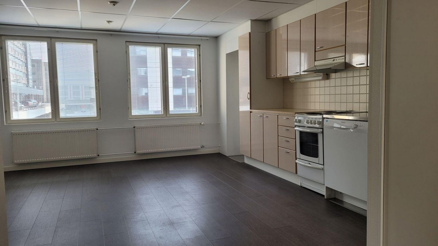 Läpi talon oleva huoneisto, jonka ikkunat ovat Asema-aukiolle ja sisäpihalle.