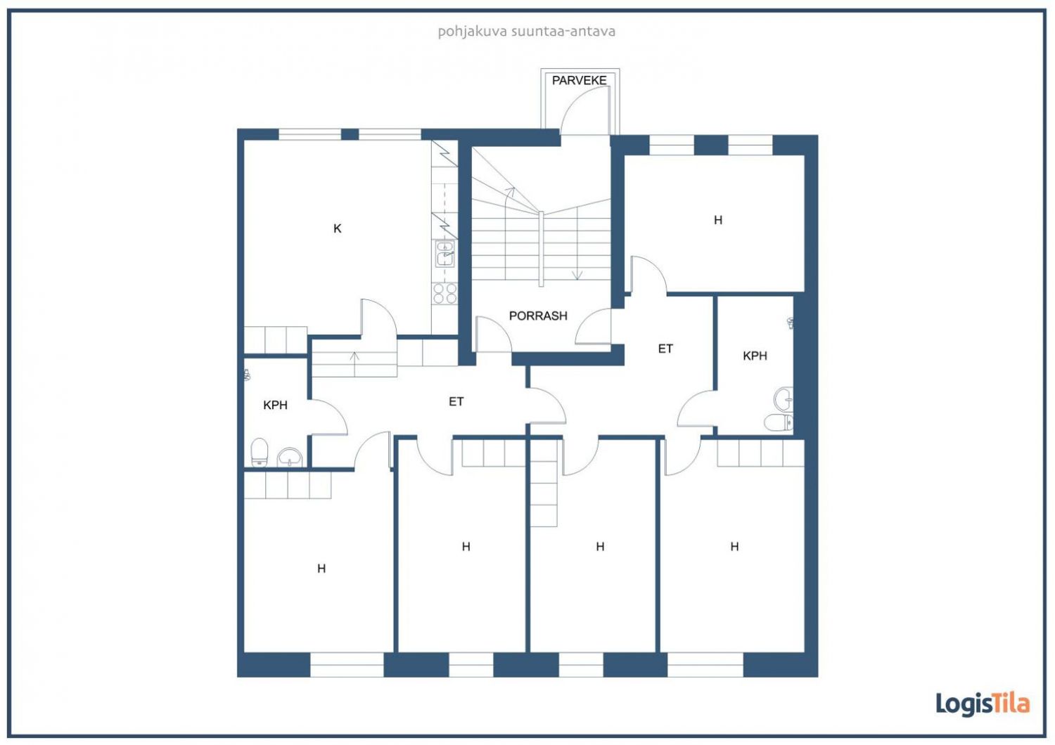 Kakkoskerroksen toimistotilassa on yhteensä viisi (5) toimistohuonetta, keittiölounge, 2 x wc, suihku, 2 x käyntiovi.