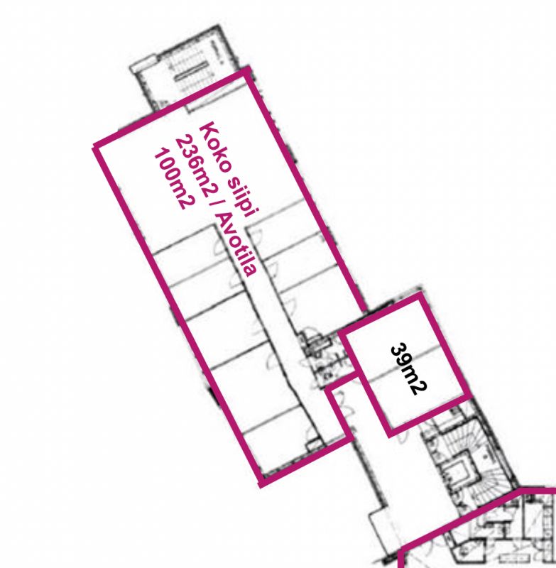 Tässä 236 m² siivessä on avotilaa n. 100 m² sekä 8 kpl erikokoista työhuonetta.