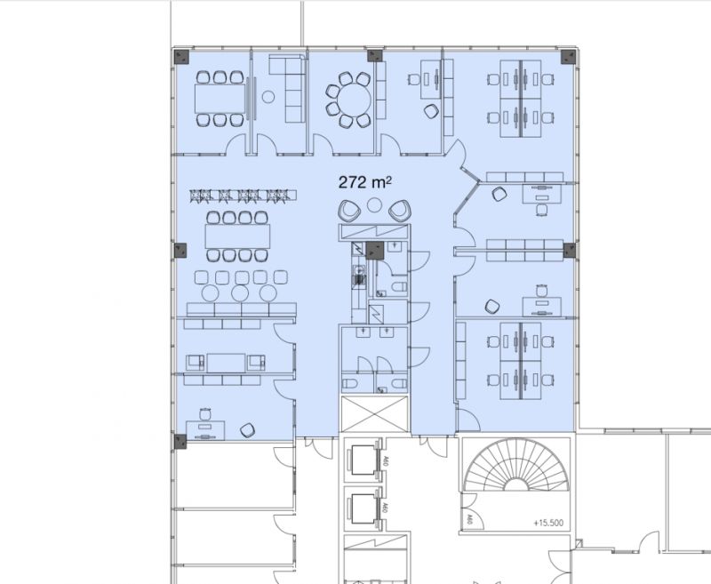 Kyseinen 546 m² toimisto sijaitsee kiinteistön 2. kerroksessa. Toimisto on huoneellinen, ja siihen kuuluvat omat keittiö- ja wc-tilat. Koko kerros jaettavissa 3-4 käyttäjälle: 273 m², 546 m², 818 m² ja 1091 m² osiin. Kuvat ovat yleis- ja havainnekuvia kiinteistön tiloista.