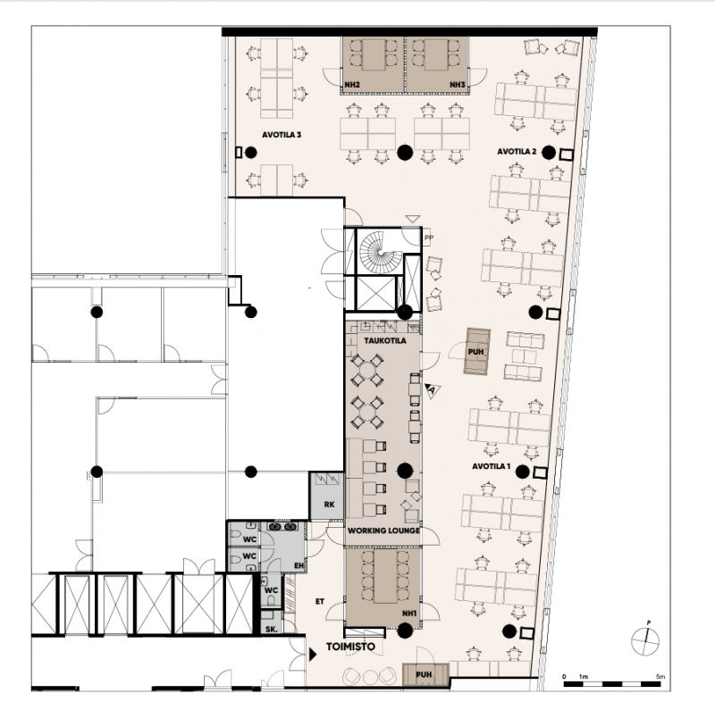 Vuokrattavana 4. kerroksen täysin remontoitua, muuttovalmista, avaraa toimistotilaa. Tilassa on avotila, 3 neuvotteluhuonetta, 3 puhelinkoppia, oma keittiö ja wc:t.