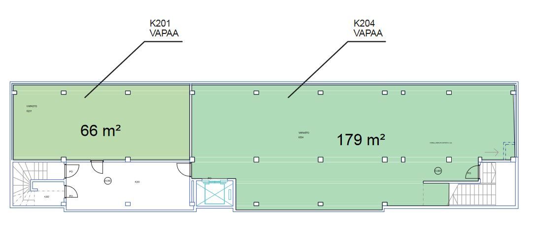 Vapaana varastotilaa eri kokoluokissa, kuten tämä 66 m2 varasto K2-kerroksessa. Ohessa kellarikerroksen pohjapiirros sekä yleiskuvia kiinteistön muista tiloista.