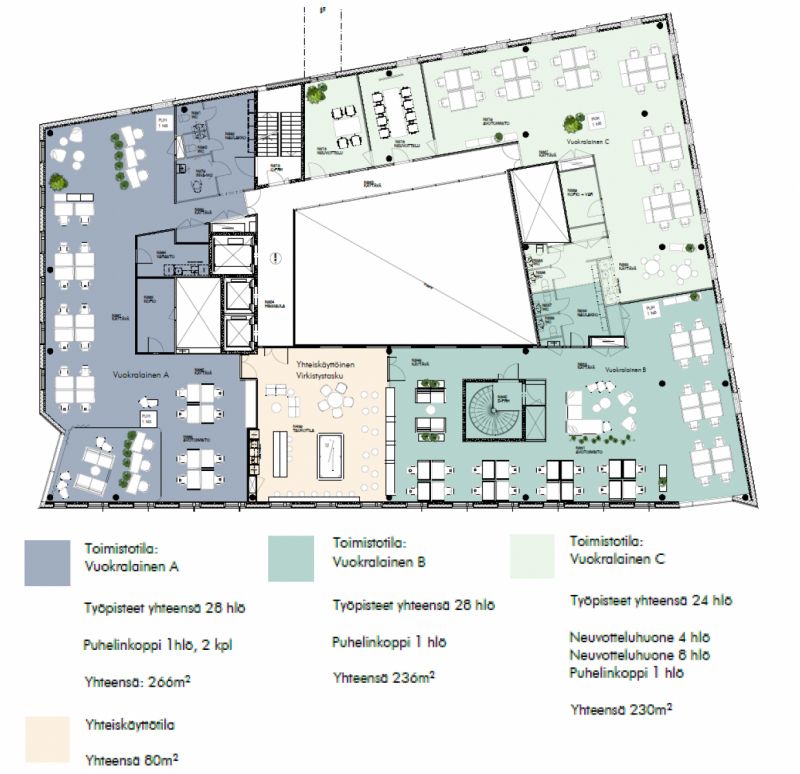 Kerroksen koko on n. 850 m², ja kerros on jaettavissa jopa kolmelle yritykselle.