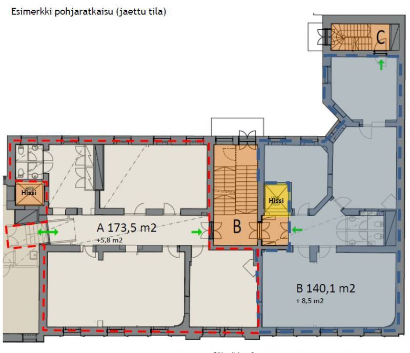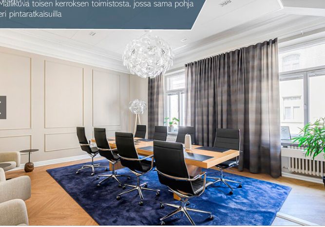 Vuorataan muutamia vuosia sitten täyssaneerattu toimistotila, joka sisältää ison neuvotteluhuoneen, kaksi työhuonetta, keittiötilan sekä WC-tilat (pohjakuvassa tila B 140,1 m2). Tilaan on kaksi sisäänkäyntiä, toinen Rikhardinkadun puolelta ja toinen kulunvalvotun hissin kautta Kasarmikadulta. Ota yhteyttä ja sovi esittely, vuokrauspalvelummme on tilanhakijoille maksuton.