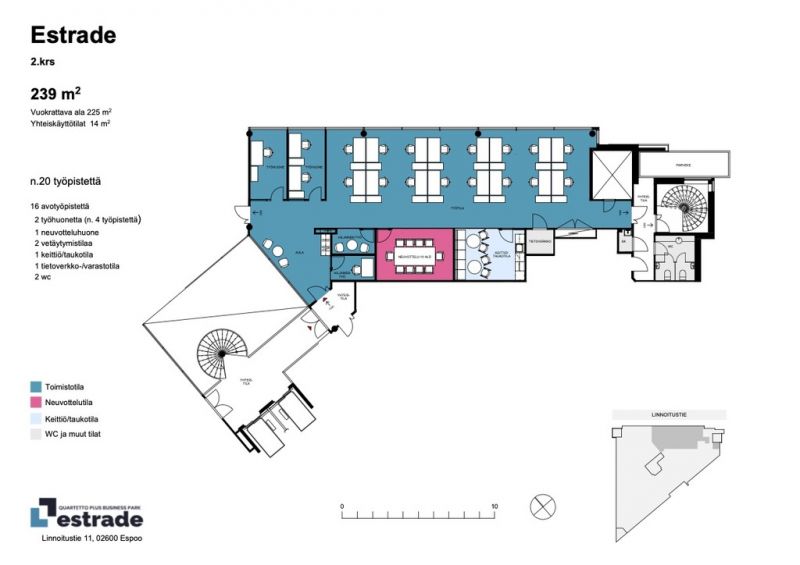 Tämä toimistotila on kooltaan 225m2 ja se sijaitsee Estrade-rakennuksen 2. kerroksessa. Toimiston pinta-alaan tulee lisäksi 14m2 jyvityksiä, eli osuus yhteiskäyttöalueista. Tilaan kuuluu 2 työhuonetta, yksi neuvotteluhuone ja yksi tietoverkko-/varastotila. Tilassa on oma keittiö/taukotila sekä kaksi wc:tä.