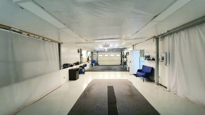 Ensimmäisessä kerroksessa (522,72 m2 ) autovarasto-/liiketilan lisäksi taukohuone, 2 wc:tä ja erillinen yksiö keittiöllä ja wc:llä. Kerrokseen sisäänajo käyntiovellisen nosto-oven tai nosto-ovellisen autopesun kautta talon takaa. Autovaraston korkeus 3,13 m. sisään ajettavaa ovea, sosiaalitilat, asfaltoitua pihatilaa.