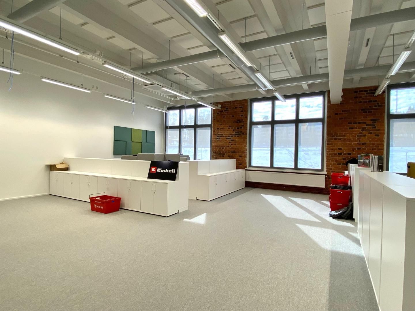 Uudet toimistot ovat modernit, mutta vanhaa kiinteistöä kunnioittavat. Mm. vanhat punatiiliseinät jäävät näkyviin.