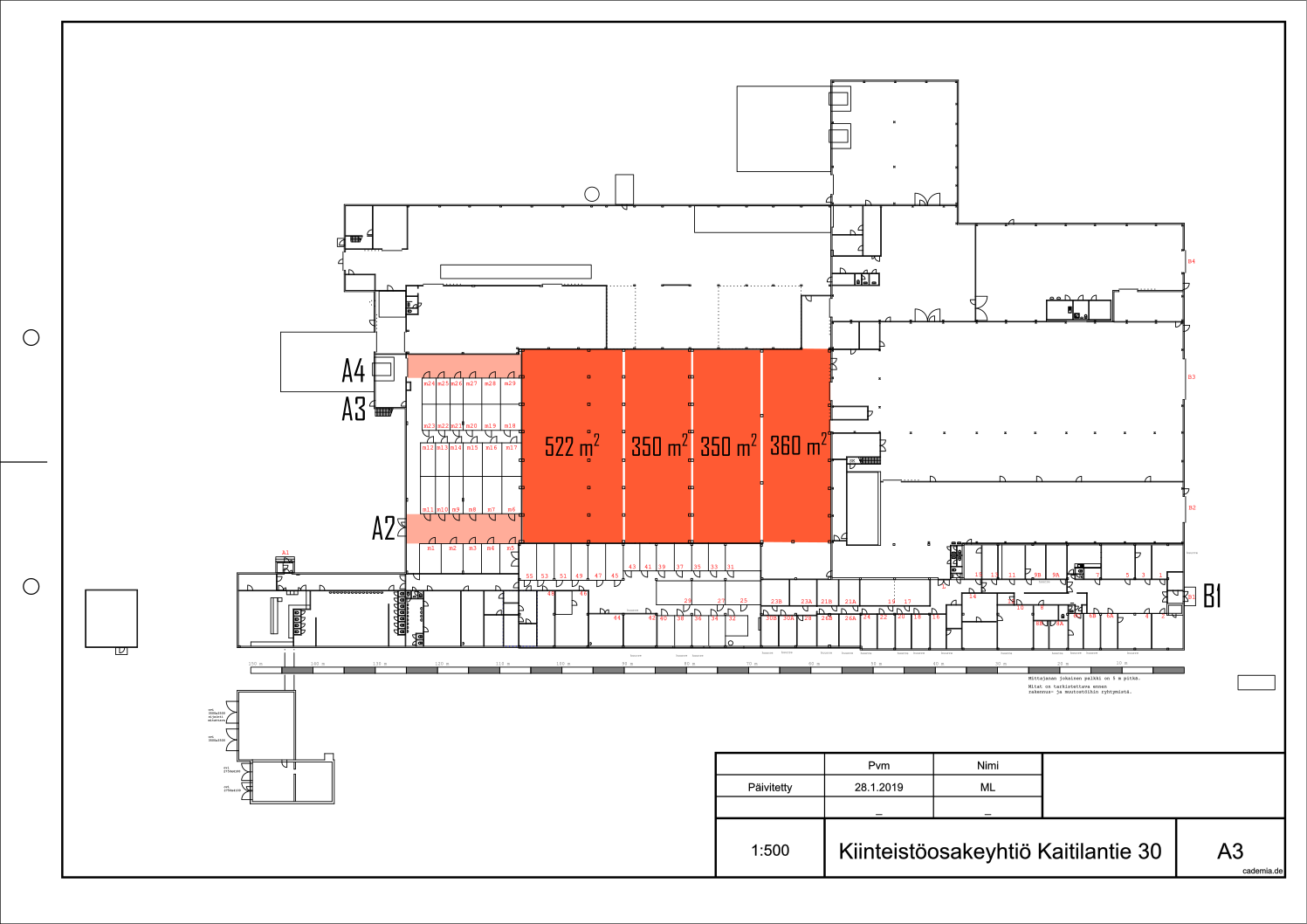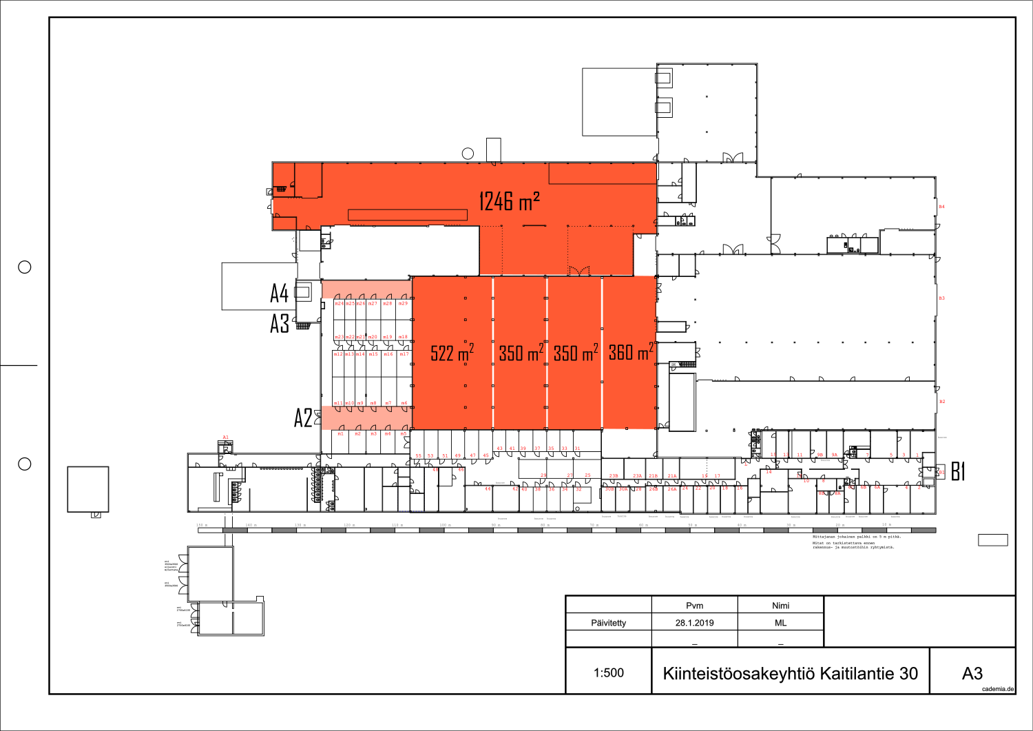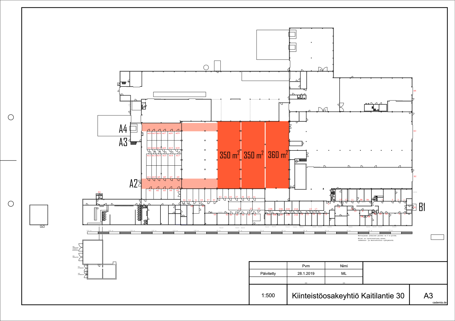 Tila on myös mahdollista jakaa 1582 m² ja 1060 m² kokoisiin osiin.