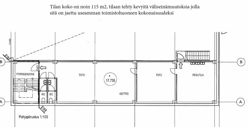 Tilan koko on noin 115 m², tilaan tehty kevyitä väliseinämuutoksia jolla sitä on jaettu useamman toimistohuoneen kokonaisuudeksi.