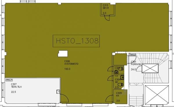 Tila koostuu avotilasta, joka on tällä hetkellä betonipinnoilla. Tila on muokattavissa vastaamaan käyttäjän tarpeita.
