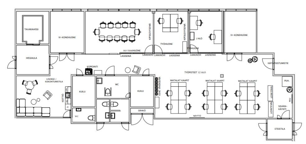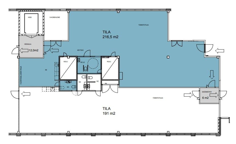 Tämä toimistotila tarjoaa mahdollisuuden tehokkaaseen työskentelyyn erinomaisella sijainilla. Tällä hetkellä avoimeen tilaan voidaan toteuttaa tilaratkaisuja monipuolisesti, ja vuokralainen pääsee vaikuttamaan myös tulevaan lattiamateriaaliin (nyt betonilla). Avokonttoria täydentämään saadaan erillisiä huoneita, joissa onnistuu rauhallisempi työskentely tai tiimin keskeinen toiminta.