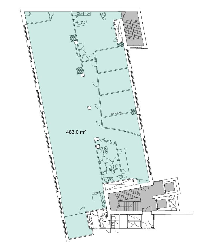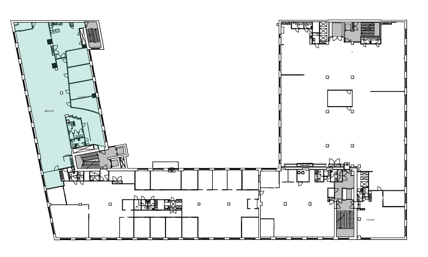 Vuokrattavana korkea, muuttovalmista toimistotilaa, jossa on useita huoneita sekä avotilaa.