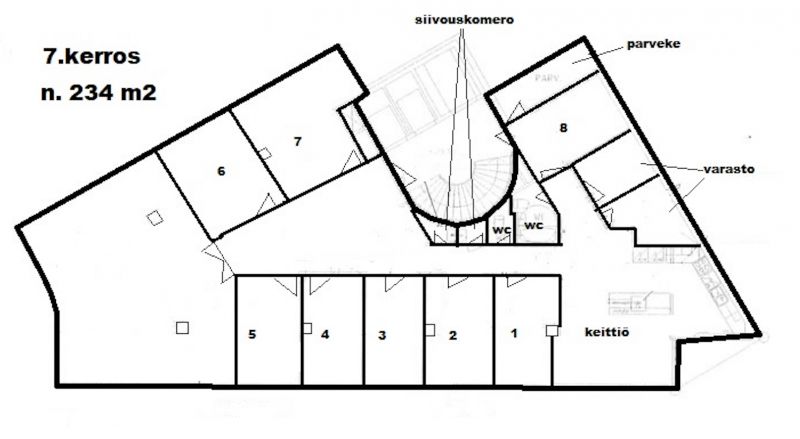 Ilmastoidussa tilassa on 8 työhuonetta, iso avotila, avokeittiö, 2 varastoa ja 2 wc:tä, jossa toisessa on suihku. Tila kattaa koko 7.kerroksen.