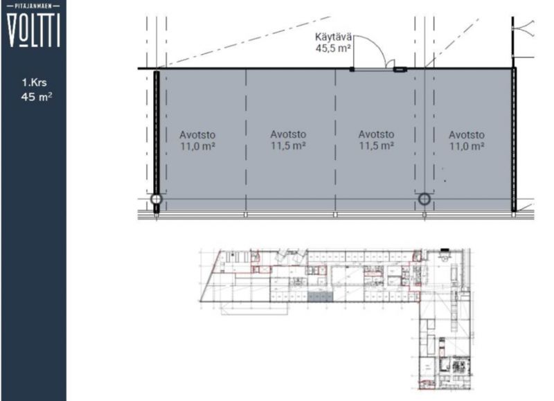 Tämä toimistotila on kooltaan 46 m² ja se sijaitsee kiinteistön 1. kerroksessa.