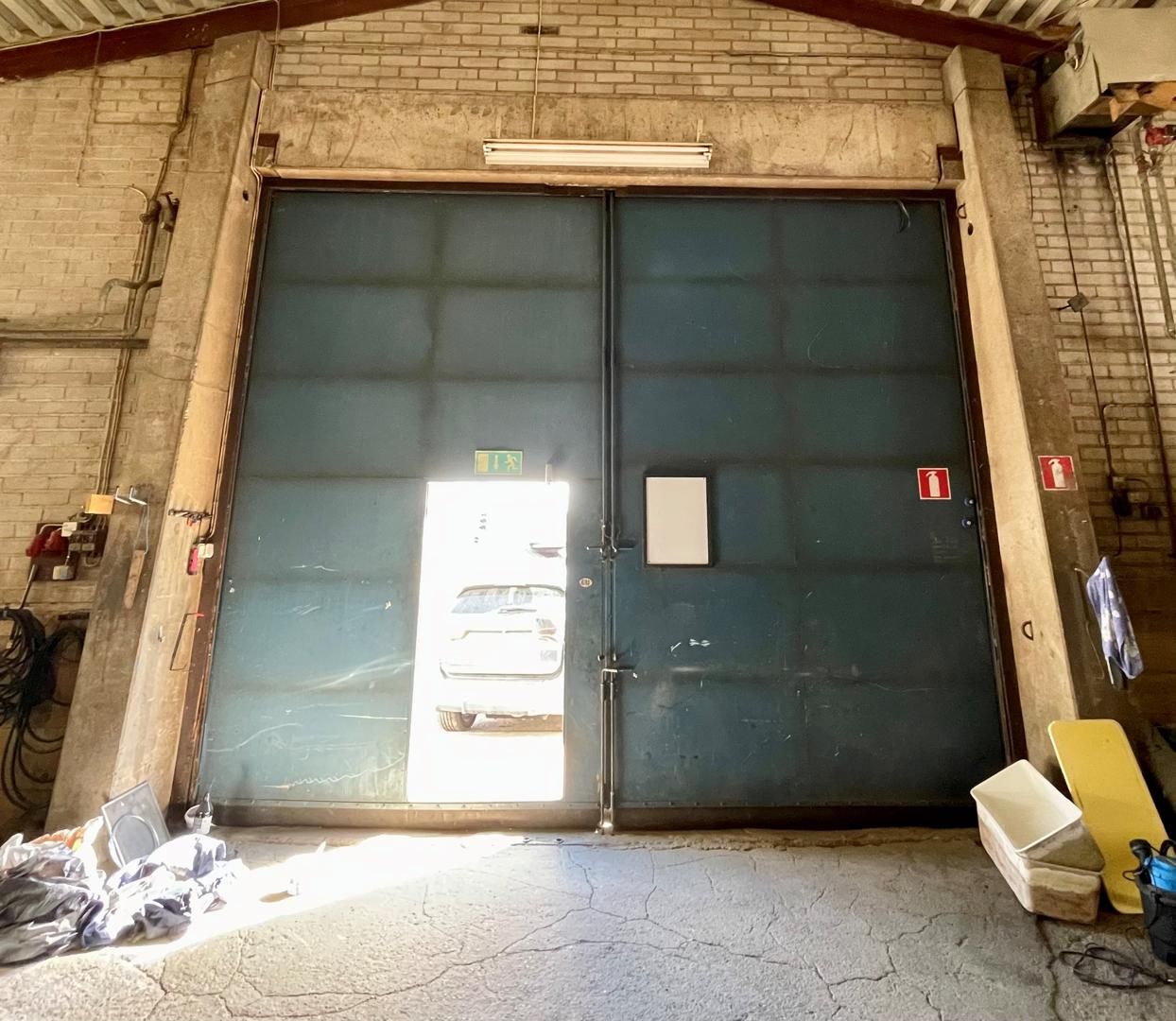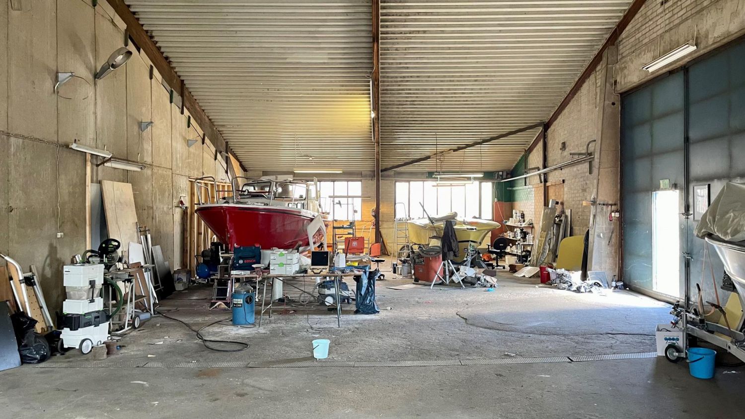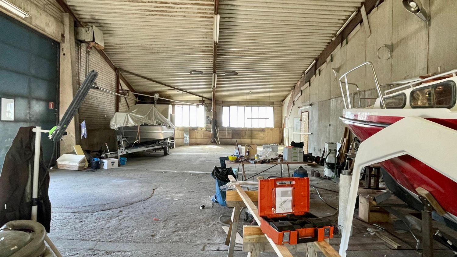 Iso taiteovi mahdollistaa vaikkapa isompienkin veneiden tai ajoneuvojen siirtelyn. Tällä hetkellä halli toimii veneiden säilytys- ja korjaustilana. Avoin kattorakenne, tila on keskeltä korkea. Betonilattia.