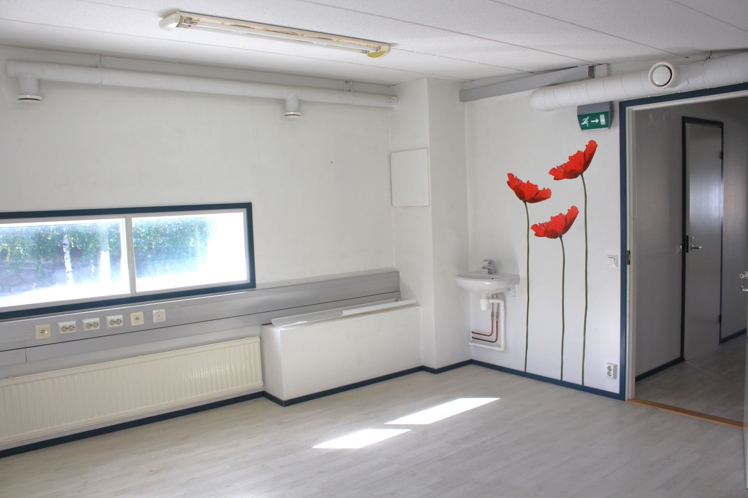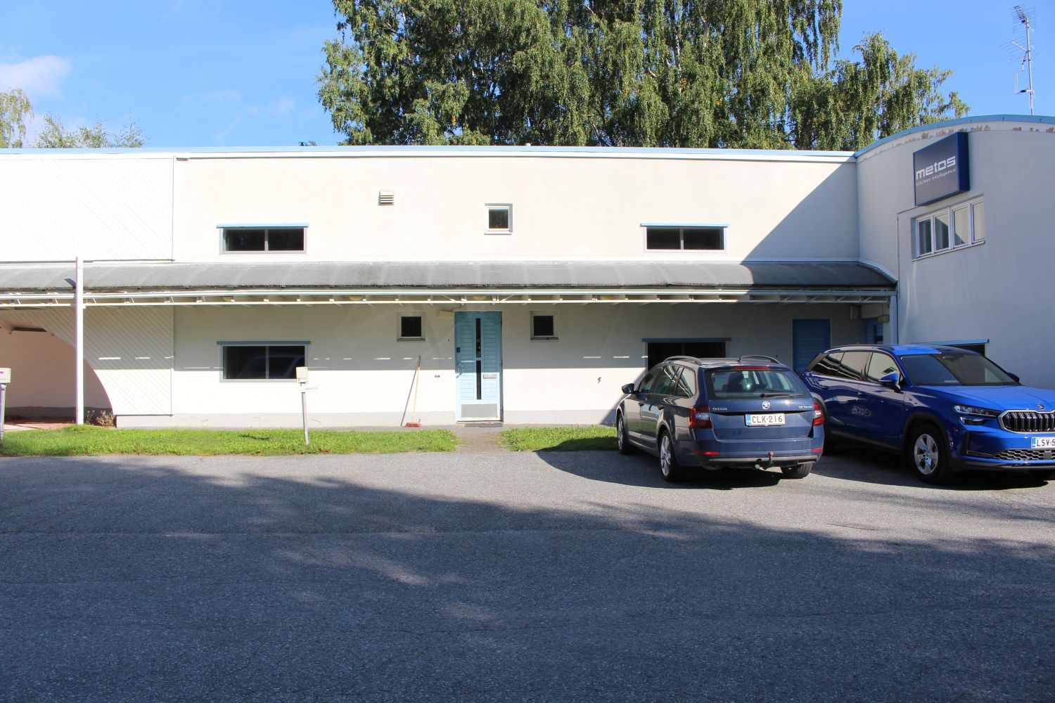 Yhteinen pääsisäänkäynti toisen vuokralaisen kanssa. Rakennus on alunperin valmistunut arkkitehtitoimiston käyttöön.