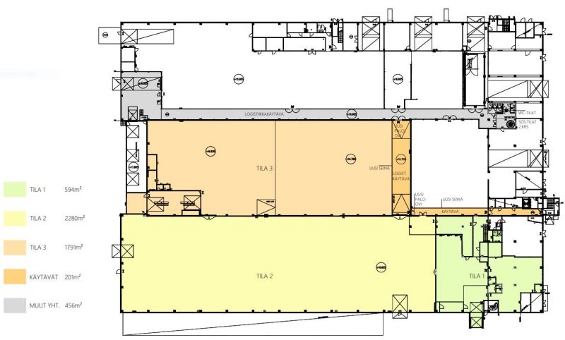 Vuokrattava ala yhteensä 5243 m2. Toimitila on mahdollista jakaa 2-3 toimijalle.
