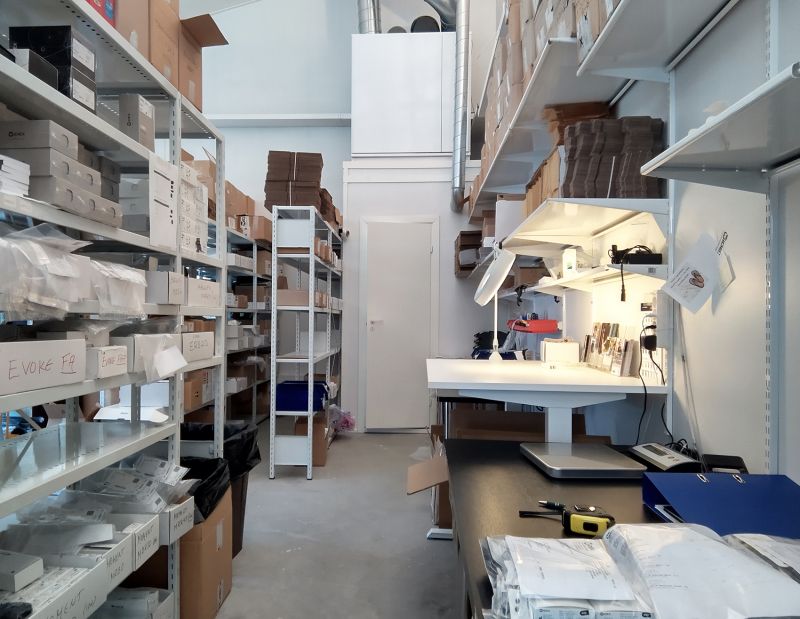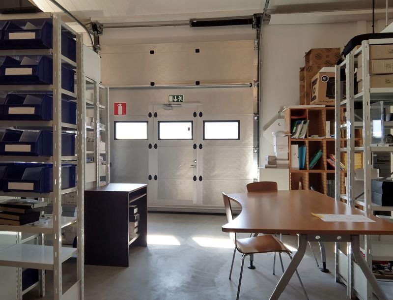 Ensimmäisen kerroksen toimiston yhteydessä on nosto-ovellinen (L 3,1 m x K 3,15 m) varastohallitila, jossa on myös lattiakaivo. Halli on erotettu toimistosta kevyellä väliseinällä, jota voi tarvittaessa siirtää tai sen voi purkaa pois. Tilassa on koneellinen ilmanvaihto ja ilmalämpöpumppu, jolla huoneistoon saa kätevästi viilennystä hellepäivinä. Toimistohuoneen yhteydessä on minikeittiö ja hallin yhteydessä wc.
