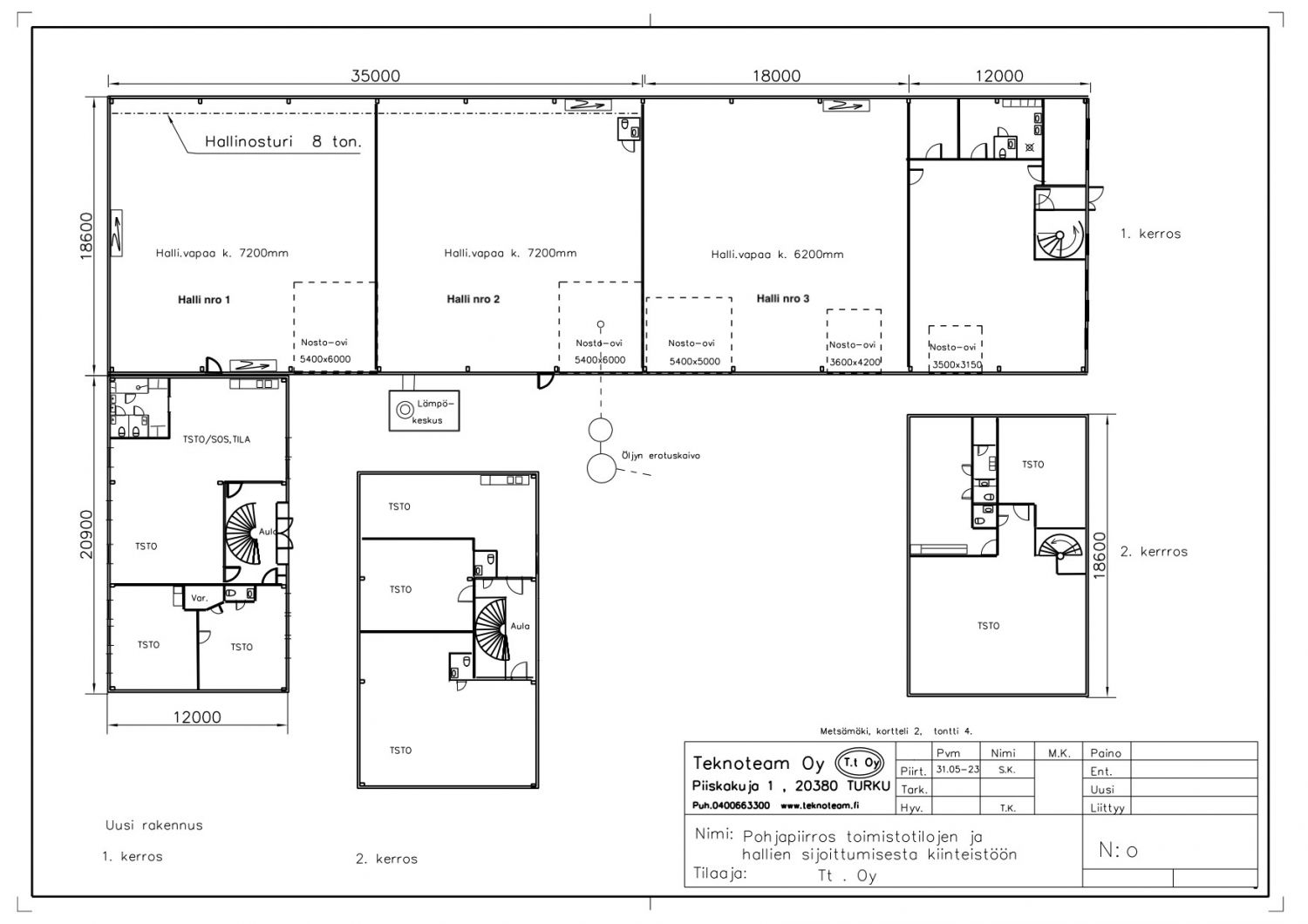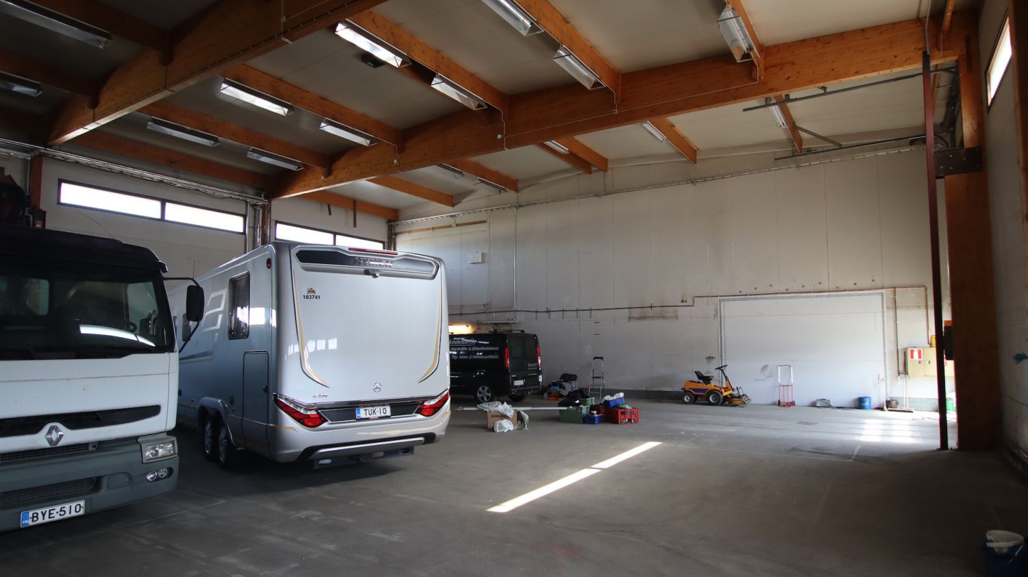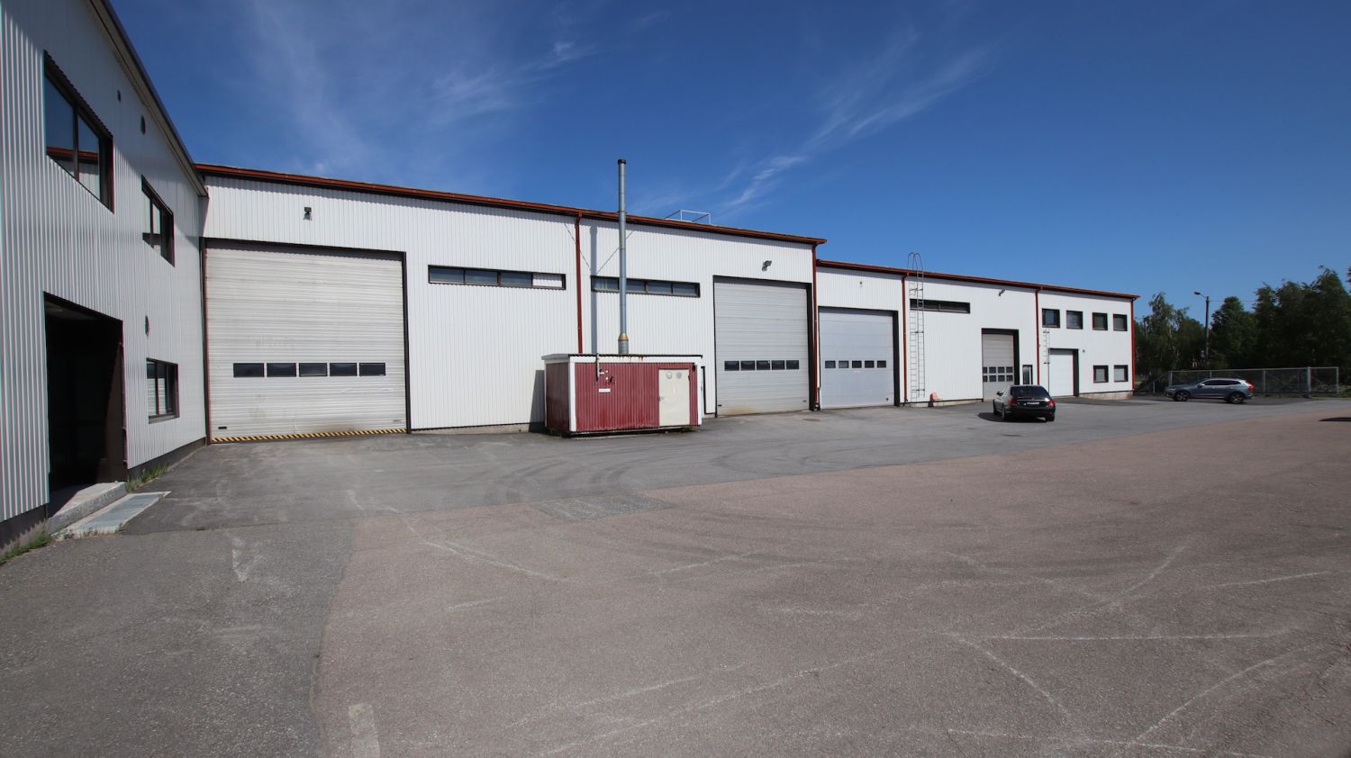Tilakokonaisuus, jossa n. 960 m2 hallitilan lisäksi n. 240m2 toimisto-sos.tiloja. Hallit kolmessa lohkossa, halli nro 1 ja nro 2 väliseinä helposti tarvittaessa yhdistettävissä. Näiden hallien vapaa korkeus 7,2metriä ja niissä 8 t nosturi. Halli nro 3 vapaa korkeus 6,2 metriä. Hallissa nro 1 on lattiakaivo valmiina, muissa halleissa mahdollista toteuttaa. Tiloissa paineilmaverkosto valmiina. Nosto-ovet: 2 kpl 5,4m x 6,0m sekä 1 kpl 5,4 x 5,0 ja 1 kpl 3,6 x 4,2m . Lattian kantavuus 2 500kg / m2.