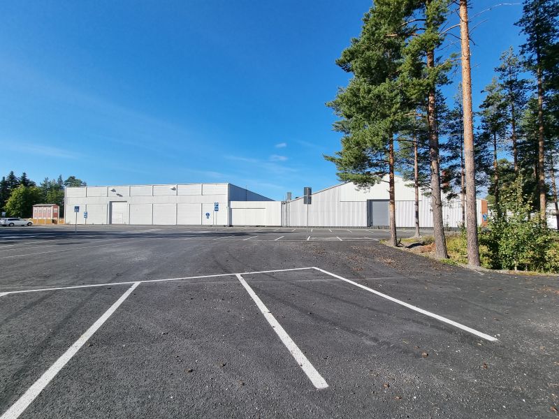 Asfaltoidulla pihalla paljon parkkipaikkoja.