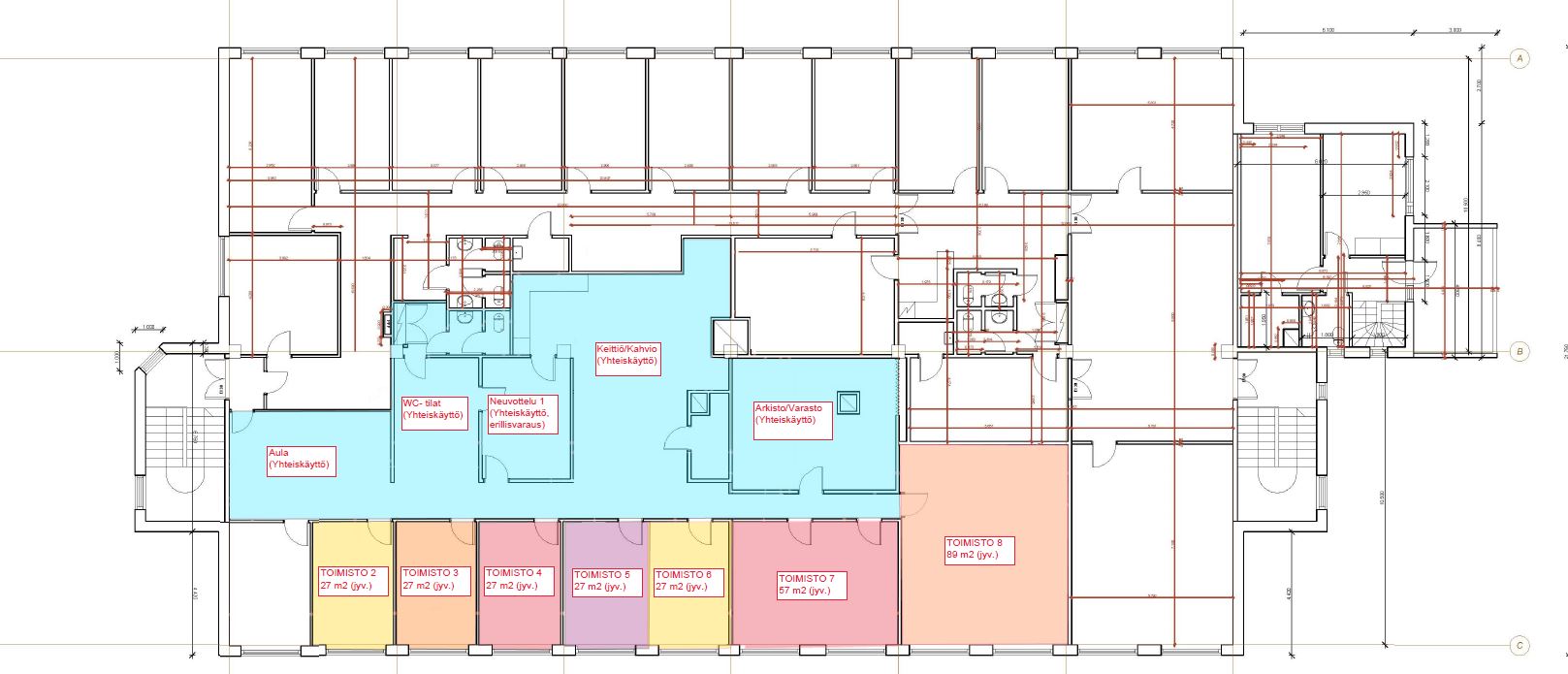 Kohteesta on mahdollista vuokrata erillisiä toimistohuoneita 27 m2 - 89 m2 kokoluokassa. Kysy lisää tästä mahdollisuudesta!