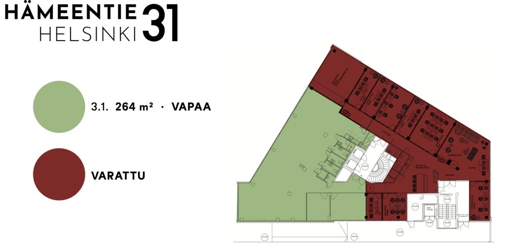 Hämeentie 31 on upea toimistokiinteistö Kalliossa, Sörnäisten kurvissa. Kiinteistö sijaitsee loistavien liikenneyhteyksien varrella Sörnäisten metroaseman vieressä, lähellä Hakaniemen palveluja. Kiinteistössä on vasta uusittu ilmanvaihto ja modernisoitu talotekniikka. Kiinteistön käyttäjille on vuokrattavissa talon ylimmistä kerroksista neuvottelutiloja sekä ylimmän kerroksen sauna ja tapahtumatilaa. Toimitiloja on mahdollista muunnella ja personoida yrityksen tarpeiden mukaan.