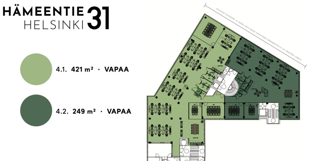 Hämeentie 31 on upea toimistokiinteistö Kalliossa, Sörnäisten kurvissa. Kiinteistö sijaitsee loistavien liikenneyhteyksien varrella Sörnäisten metroaseman vieressä, lähellä Hakaniemen palveluja. Kiinteistössä on vasta uusittu ilmanvaihto ja modernisoitu talotekniikka. Kiinteistön käyttäjille on vuokrattavissa talon ylimmistä kerroksista neuvottelutiloja sekä ylimmän kerroksen sauna ja tapahtumatilaa. Toimitiloja on mahdollista muunnella ja personoida yrityksen tarpeiden mukaan.
