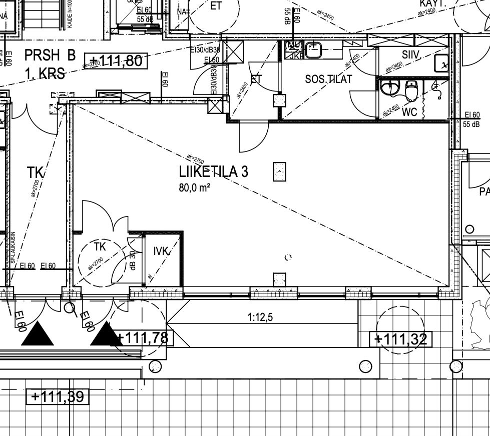 Vapaana vuokrattavaksi on nyt 80m2 tila, jossa itse myymälätilan lisäksi on keittiö/taukotila, wc/suihkutila sekä varastohuone vesipisteellä. Lisäksi myös erillinen toimistohuone, joka ei näyt pohjakuvassa. Kiinteistön saneeraustyöt ovat loppusuoralla.