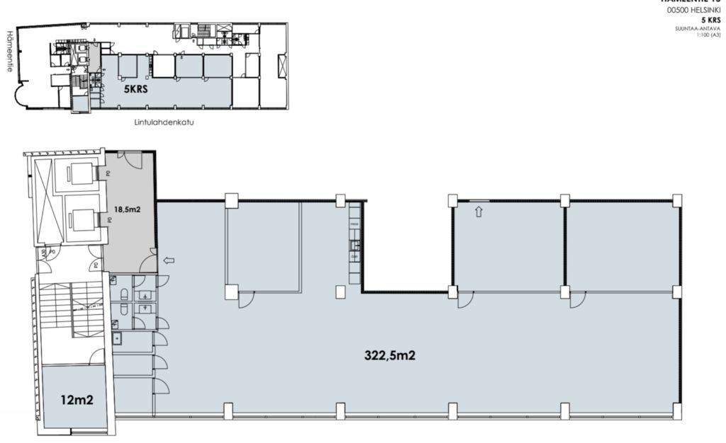 Tämä 323m2 kokoinen toimisto sijaitsee kiinteistön 5.kerroksessa. Tilassa on avotilan lisäksi muutama työhuone sekä omat wc-tilat.