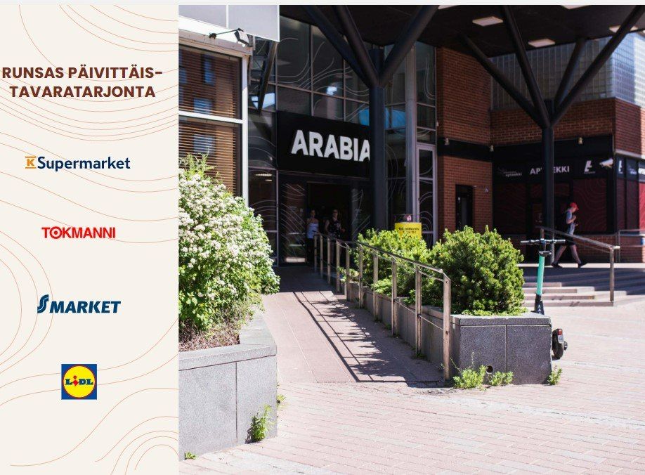 Helsingin keskustaan on vain 4km matka. Arabian kauppakeskus sijaitsee hyvien kulkuyhteyksien varrella ja raitiovaunu pysähtyy suoraan kauppakeskuksen viereen.