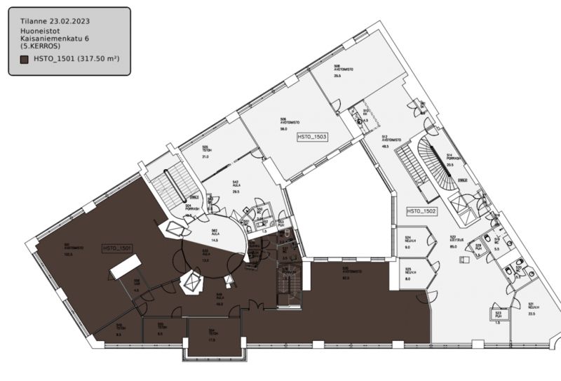 Tämä moderni 317,5m2 toimistotila sijaitsee kiinteistön 5. kerroksessa. Toimistossa on avotilaa, kolme huonetta, aulatila sekä omat wc-tilat ja keittiöpiste.