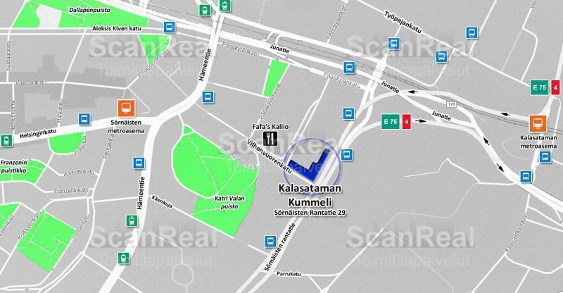 Bussipysäkki 100 m, Metro Sörnäinen 350 m, Metro Kalasatama 700 m, Raitiovaunu 400 m, Helsingin keskusta 3 km, Pasilan juna-asema 3 km, Lentokenttä 18 km