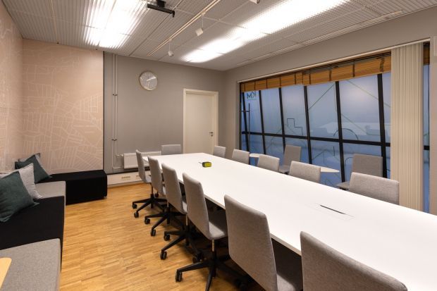 Toisen kerroksen loistotasoinen toimisto, jonka suuret ikkunat tekevät tilasta elävän ja valoisan.