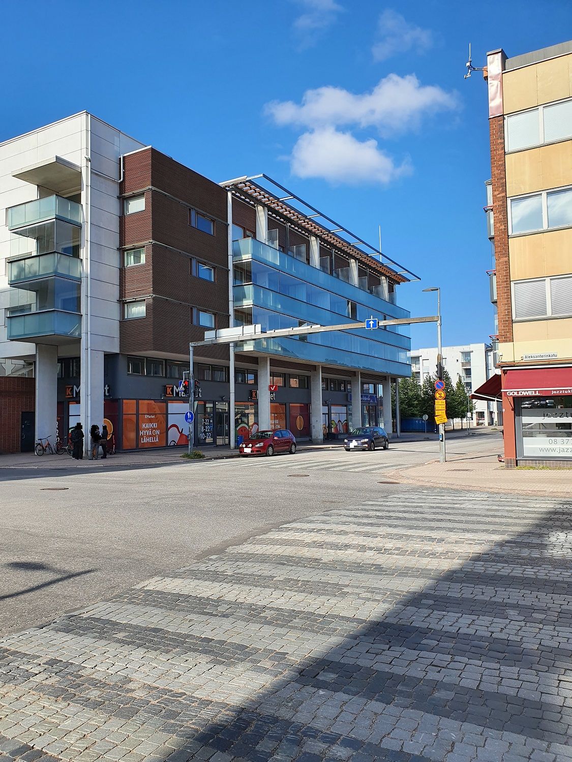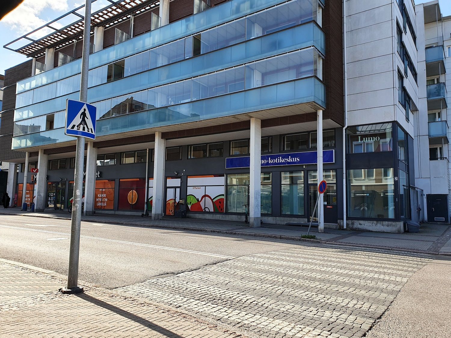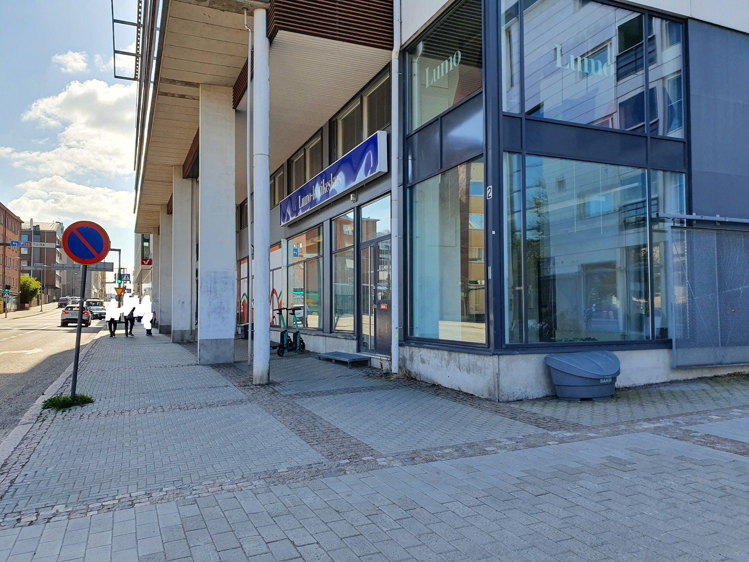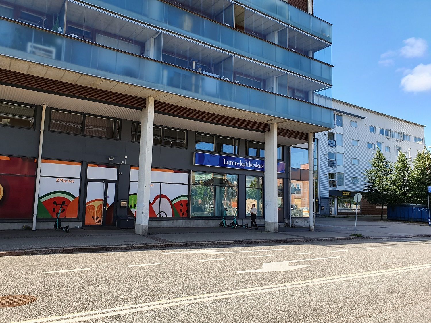 Liiketila sijaitsee rakennuksen nurkassa, vieressä toimii K-market.