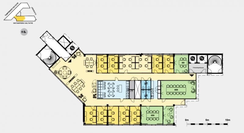 Tämä 475 m² tila sijaitsee kiinteistön 2. kerroksessa. Toimisto on mahdollista remontoida vuokralaisen tarpeiden mukaan. Tilassa on koneellinen ilmanvaihto sekä jäähdytys. Saatavilla hyvin autopaikkoja. Pohjakuva on esimerkki mahdollisesta tilasovituksesta.