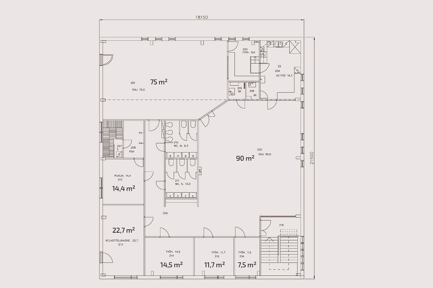 Huoneistoselitelmä: Toimisto-, ja varastotilaa, keittiö, sauna, suihkut, wc-tilat