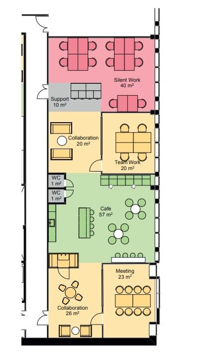 Oheinen pohjakuva on yksi ajatus millainen monitilatoimisto tilaan voisi tulla, moni muutkin pohjaratkaisu olisi mahdollinen - ota yhteyttä ja tehdään tähän uusi toimistonne!