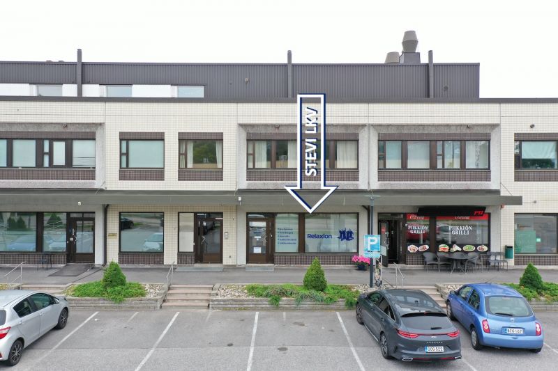 Liikekiinteistön edessä on hyvin pysäköintipaikkoja.