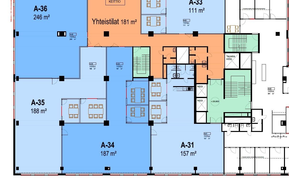 Kravattitehtaan toinen kerros jaettiin pieniksi muuttovalmiiksi toimistoiksi, joista useimmat jakavat vessat ja keittiön. Tämä oli mieletön suksee ja nuo kaikki toimistot vuokrattiin nopeasti. Nyt sama tehdään kerrokseen kolme. Siellä olisivat mahdollisia mm. nämä toimistot 157 m2, 187 m2 ja 188 m2, muitakin kokoja löytyy - kysy lisää!