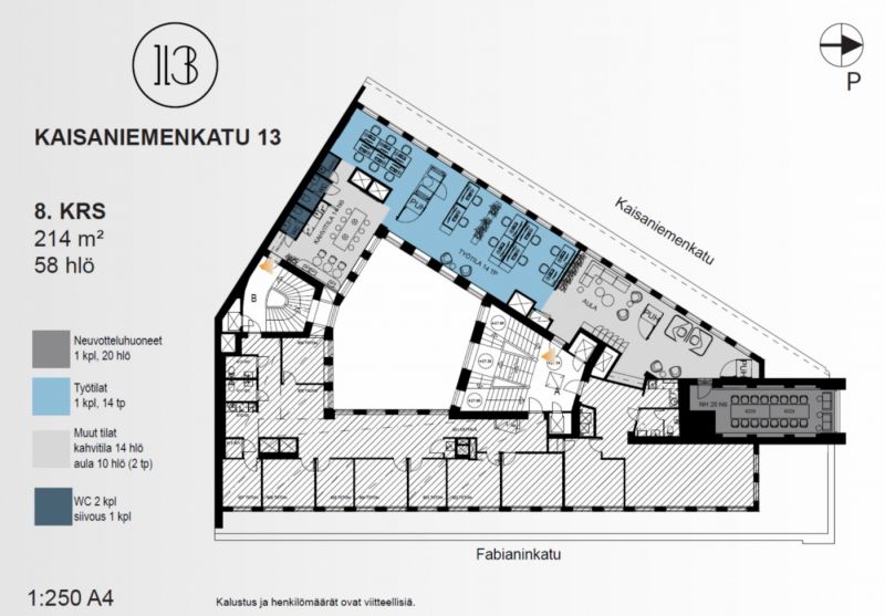 Vuokrataan kahdeksannen ylimmän kerroksen 214m2 toimistotila. Kerrokseen tulee kaksi henkilöhissiä. Toimistilaan on kaksi sisäänkäyntiä A -ja B- portaan kautta. Tilassa on kahdeksan lasitettuja toimistohuonetta sekä yksi isompi toimistohuone, iso neuvottuhuone sekä keittiö jonka yhteyteen saa tehtyä loungetilan. Kaisaniemenkatu 13 on valloittava toimitilakohde loistavalla paikalla Helsingin keskustassa. Vuonna 1929 valmistunutta kolmionmuotoista kiinteistöä voidaan pitää Kaisaniemen maamerkkirakennuksena. Aikakaudelle tyypilliset punatiiliset julkisivut on säilytetty alkuperäisessä asussaan.