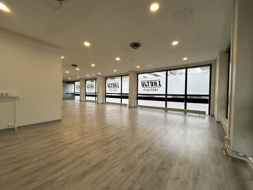 Katutason liiketila näkyvällä ja vilkkaalla paikalla. Vieressä keittiökalustemyymälöitä. Tila on toiminut myös keittiökalustemyymälänä. Tila jakaantuu katutason liiketilaan 143,5 m2 ja kellarin varasto- ja sosiaaltilaan 45 m2. Alakerrassa on sauna ja kolme suihkua.