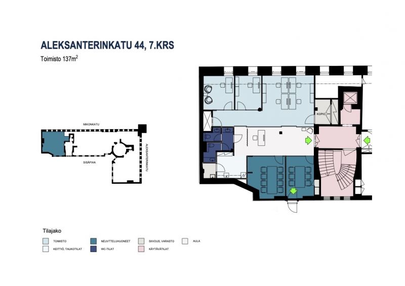 Uniikki ylimmän kerroksen 137 m² toimistotila Mikonkadulla.